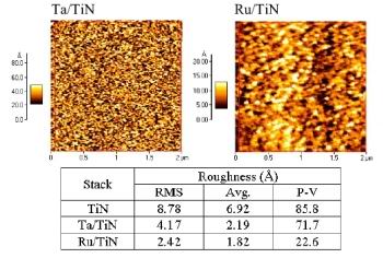 在TMR元件中层叠膜厚度仅为数nm的薄膜的MRAM中,加工的不稳定性也是造成成品率下降的重要原因。其原因比如,隧道势垒层(也称绝缘层,Al2O3)的膜厚度只要改变0.1nm,电阻值就会在数倍范围内变化。三星此次报告说,通过在TMR元件的下部电极(TiN)和引脚层之间将钌用作缓冲层,就能够形成表面粗糙度非常低的平坦衬底(图2)。所制作的下部电极部位的表面粗糙度(平均值)方面,不使用缓冲层时非常大,达到了0.692nm,而在缓冲层中使用钽时为0.219nm,使用钌时却可以将表面粗糙度控制在0.182nm(图3)。