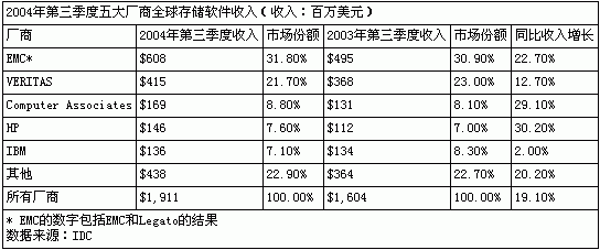 存储在线 12月15日北京消息:据IDC的最新报告,第三季度全球存储软件市场季度收入首次突破19亿美元,同比增长19.1%。 IDC存储软件研究总监Bill North表示,市场持续以两位数增长率增长,第三季度存储软件支出创下新高。存储容量需求和复杂性不断提高,而系统成本则稳步下降。本季度,在每100美元存储系统支出中,用户在存储软件上的支出增长到近36美元。这表明用户把更多的支出投入到允许他们有效管理和保护商业信息资产的软件中。 保持从第二季度开始的势头,第三季度所有主要存储软件功能市场收入都有两位数的同比增长率。存储资源管理市场增长最快,同比增长27.3%。备份和存档软件市场依然是最大的功能市场,同比增长17.4%。存储复制软件和文件系统软件市场表现也较强,分别增长13.7%和10.3%。 本季度EMC(包括EMC和Legato)以31.8%的收入份额在整个市场领先。VERITAS以21.7%的收入份额保持第二,同比增长12.7%。Computer Associates超过惠普和IBM,以8.8%的收入份额位居第三。惠普和IBM收入份额分别为7.6%和7.1%。本季度惠普和Computer Associates增长最快,同比增长率分别为30.2%和29.1%。 (文/网络世界)