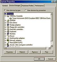 步骤1:请先确认Windows98可以自动辨认IEEE1394的Host Controller,并安装成为"Texas Instruments OHCI Compliant IEEE 1394 Host Controller",如下图: