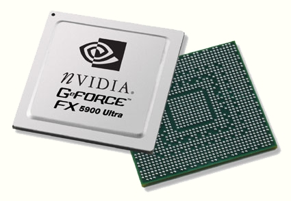 NVIDIA准备要用新款FX 5900(NV35)系列来挽回局面。很明显地,这款产品并非全新设计,但许多地方已经更新并改进过。举例来说,它的内存总线已从128加宽到256位,而且不再使用DDR-II内存、而改用常见的DDR内存模块。芯片核心频率从500 MHz减少到450 MHz以提升成品率。当得知新的散热系统音量远远比不上吸尘器、而且工作音量大都维持在可忍受范围时,大多数的玩家和硬件测试员肯定会松了一口气。最后一点,预期会有一个新的驱动程序用以提升FX系列产品的性能,并改善FSAA(全屏反锯齿)和各向异性过滤效果下的图像质量。此外还有一些其它改善项目,应该有助于弥补时钟频率的损失。新的内存接口(IntelliSample HCT)将4:1的色彩压缩效率改善了50%,这一点应该会对FSAA性能有所帮助。已经到了第2.0版的CineFX引擎在功能上也有所增强,并且提供了一项称为“UltraShadow”的新技术。采用这项功能并使用阴影模板计算的游戏应该可以在成像速度上得到相当程度的提升。为了提供这些附加功能与改进,芯片本身内含的晶体管数目必须随之增加,目前大约使用了130百万个晶体管,比NV30足足多了5百万个。