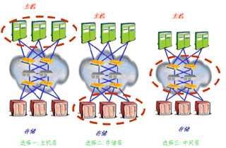 选择三:中间层,即存储的部分高级管理功能运行在中间层即Fabric层,其中分为两种方式: 内置在智能交换机型和中间层单独的appliance。IBM两种方式都有, SVC(IBM TotalStorage SAN卷控制器 SAN Volume Controler)和SVC内置MDS交换机两种结构。SVC本身作为一个单独的产品,或作为基于Cisco MDS 9000的IBM TotalStorage SAN卷控制器,它所提供的SAN卷控制器软件可以嵌入在Cisco MDS 9000光纤通道控制器和交换机的高速缓存服务模块之中。基于Cisco MDS 9000的SAN卷控制器可以帮助减少SAN网络中的端口数量,并实现了与Cisco MDS 9000家族管理功能的紧密集成。