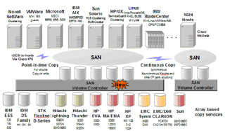 SVC 实现了虚拟存储层(Virtualization Layer)的功能,将存储智能加入到SAN的网络中。SVC为各种不同的存储设备提供了一个统一的数据复制平台,例如瞬间复制FlashCopy和远程复制Metro Mirror。这些复制功能都允许源磁盘卷和目标磁盘卷可以存在于不同品牌的磁盘阵列上。SVC对当前所有的主流存储系统都支持,包括IBM、HP、EMC、HITACH、SUN等。智能交换机的数据安全功能是由智能交换机本身提供,与存储无关;一般存储的安全功能是由存储的控制器提供,必须要一对相同厂商甚或相同机型之存储才可支持(如IBM的PPRC只有同系列的存储才支持),而应用SVC则可搭配本地的中高档存储与远端低阶存储进行数据安全保护。