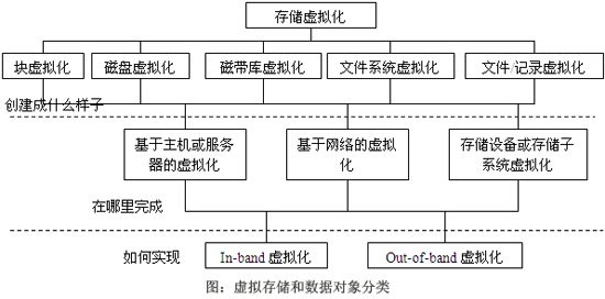 如SNIA的虚拟存储的分类所示,一般把虚拟分成如下三类:基于主机或服务器的虚拟化、基于磁盘或磁盘子系统的虚拟化和基于网络的虚拟化。