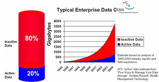 根据业界的分析和SNIA统计,在信息系统中平均有80%的空闲数据。由此可见这些非活动数据可以转移至低性能的磁盘或阵列之上,如下图所示。因此,我们没有必要将全部的数据都长期占用高昂的高端设备。利用Compellent的数据分级管理可以自动地把空闲数据迁移至低速设备之上,将有限的昂贵的存储介质分配给高度频繁访问的数据块。