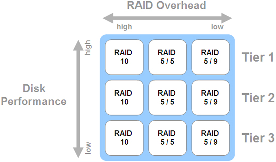 数据分级管理充分利用RAID10, RAID5等在不影响性能的条件下最大化可用存储量。高效地使用RAID5(9盘)结构能够比一般的全冗余RAID10节省40%的存储空间。系统分层矩阵结构如下图。