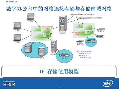 Peggy Shen女士表示中小企业存储市场的机会非常大,中小企业存储将会带来广泛的收入机会,2010年将会超过100亿美元,尤其是在IP存储领域,低成本的IP存储对于中小企业市场至关重要。我们知道IP存储通常是以千兆以太网为基础,使用多种不同方式来利用(IP)建立存储区域网络(SAN)的统称。