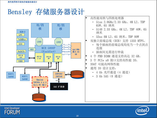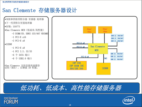 当然,除了使用Bensly平台的存储服务器之外,英特尔还推出了San Clemente存储服务器设计,San Clemente存储服务器是一款面向中低端市场的较为低价的产品平台,从内存的选用上就可以略窥一二,Bensly平台的存储服务器为了保证性能会使用FB-Dimm的内存,而San Clemente存储服务器会使用功耗和价格较低的DDRII内存。San Clemente存储服务器仍然使用Socket LGA 771针脚设计的至强处理器,英特尔将其目标定位于低功耗、低成本、高性能的存储服务器。