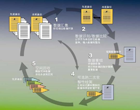 重复副本删除的5 个阶段如下:数据收集、数据识别和/或数据比较、数据重组、完整性检查、空间回收。