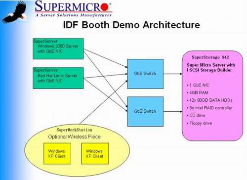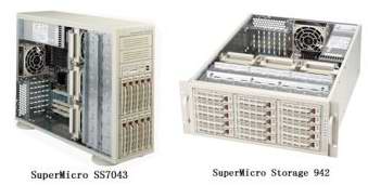 在整套系统中,磁盘阵列SuperMicro SS7043当属最主要的,其本身功能十分强大,采用双Intel P4 XEON处理器,内存支持最大可扩展到16GB DDR ECC REG,磁盘系统率先支持三个独立通道设计,并且采用先进的SATA硬盘,相对于传统的ATA IDE设备,大大增加了传输速率,提高了反应速度,其性能更加接近SCSI硬盘,而投入的成本相对于SCSI设备更加低廉,当然对于高端用户,SuperMicro(超微)更是提供了对Ultra 320 SCSI硬盘的支持。其单机本身最大支持12块硬盘,具有600W冗余电源设计,为其提供强大动力。集成双千兆网卡,轻松构建千兆网络存储。还可连接多台SuperMicro 942 Storage JBOD,每台最大可支持15块硬盘,可以根据用户使用阶段、承受能力的不同,不断扩充容量,具有超强的可用性,这就不再需要采购昂贵的主机设备。