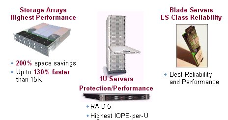 随着企业过渡到2.5英寸硬盘平台,人们将有能力开创机架和刀片式服务器产品的新纪元。新的1U服务器能提供出色的RAID 5性能,实现了数据保护和系统性能的完美组合。刀片式服务器将成为名副其实的企业级产品,具备企业级别的高可靠性和高性能。通过将相当数量的硬盘捆绑于尺寸更小的系统,存储阵列速度将获得更大幅度提升。