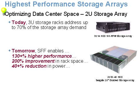 了解到这些需求后,企业存储业已全面联手,致力于实现从标准3.5英寸硬盘平台到新的2.5英寸标准的过渡。希捷科技正凭借其2.5英寸硬盘驱动器在这场转变中扮演着先锋角色,而像惠普、英特尔等领先的制造商正各自开发适当的硬件来配合这次变革。这场变革的给各公司带来的整体效益非常明显,“密度更高”的存储设备能使数据中心的空间得到更好的利用,功能则更好优化。