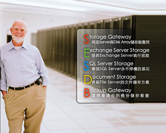 - 4. 功能强大的档案专用服务器(Document Storage):将数据存储在 Windows Storage Server 2003上,将可为企业带来强大的档案快照备份、档案共享及档案安全控管的效益。