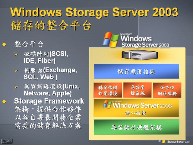 Windows Storage Server 2003为何是一个储存整合平台,企业有了它到底会有什么差别?其实, Windows Storage Server 2003其实是个具有强大储存软件运算能力,与各种不同储存硬设备连结能力的标准平台。因为它能解决目前企业环境中,磁盘阵列与服务器搭配所产生出来的有关储存应用跟管理的问题。所以Windows Storage Server 2003的目的是要去支持服务器和磁盘阵列,并且能够解决企业储存应用和管理问题,并且透过Windows Storage Server的软件运算能力去选择将数据放在最适当的储存装空间如SCSI, Fiber, or IDE的磁盘阵列,或是不同的磁带机,或是Windows Storage Server 2003本身的大容量硬盘等。