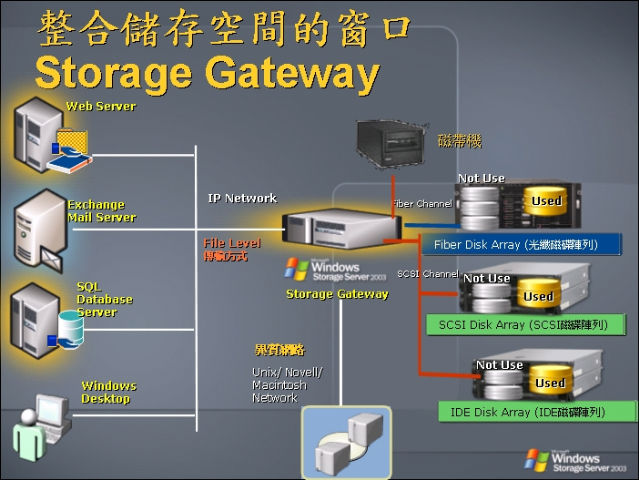 透过Windows Storage Server 2003把真正的把未利用的储存空间释放出来做为在IP网络上的更丰富的储存管理应用,是为了解决不同服务器的储存管理问题,这些服务器包括了Web、File、Exchange、SQL,以及数量最多的使用者PC,所以它的目标很清楚,Gateway的目的就是要连接服务器跟储存设备与异质网络之间去串接起来,然后把储存架构提升,跟不同Server与PC沟通,依照储存数据的来源与重要性,选择存放在最适当的储存装置里。这就是彻底解决企业储存管理的最重要的原理。。