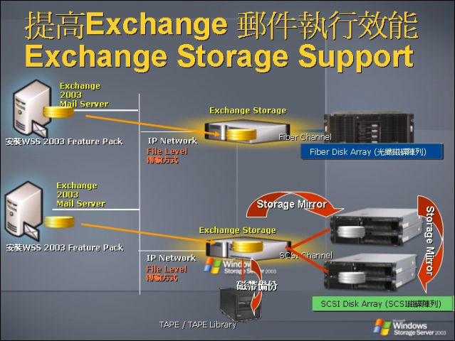 现在这个作法很简单,只要加上Windows Storage Server 2003的Feature Pack,把它安装在Exchange 2003上面,就可以直接让Exchange的Database透过IP网络直接存放在Windows Storage Server 2003上,而放在上面有什么好处,第一个就是能提高Exchange Server的效能,因为它不再需要做Database的IO和Hard Disk Swap,也少掉了CPU资源的耗费,所以原本可能一台提供了500个Mail Box,现在可能就可以提供到700、800,甚至上千个,节省了企业在硬件上的升级投资。