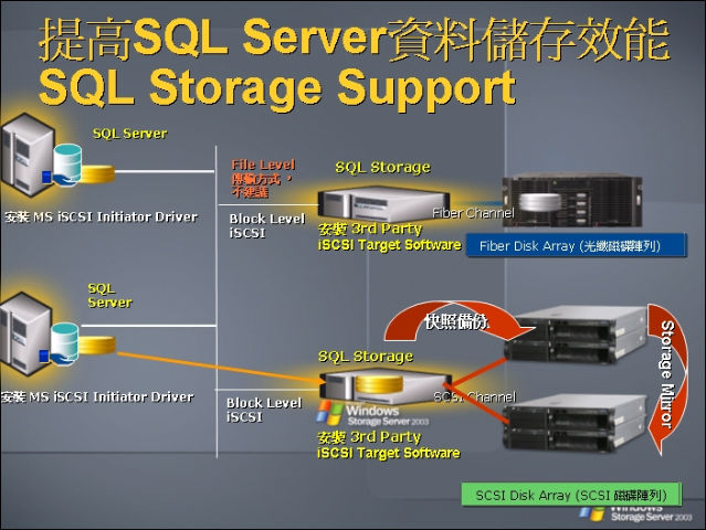 藉由免费提供的iSCSI Initiator Driver,即可将SQL Server的数据库存放在Windows Storage Server 2003上,这样的SQL架构除了可提高SQL Server的数据储存效能之外,备分时影响SQL的速度最小,与灾难回复时间最短。并且当有新的Application而要上线测试时,也不必先将数据备份出来,再安装在另一台机器上,只要先将数据Mirror出来,在测试机器上安装iSCSI Initiator Driver,即可省略过去需要先备份再倒回数据的冗长过程。