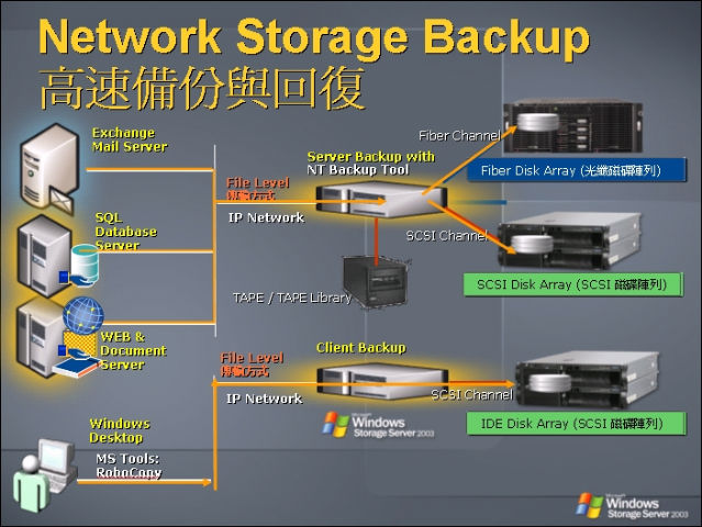Windows Storage Server 2003内建备份工具,能够支持Exchange Server、SQL Server、Web Server、File Server及其它如VERITAS、CA.、Legato等备份软件,此外,Windows Storage Server 2003内含的RoboCopy工具,可直接支持客户端的数据备份。而从Gateway的备份方式来看,当数据备份到Windows Storage Server 2003,其实也等于备份到后面的磁盘阵列上,因为先备份到这边可以当做是cache,然后可再备份到像是Tape的其它储存媒体。