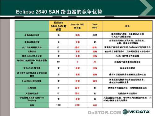 The Evaluator Group 代表任迪•康思(Randy Kerns)表示:“市场逐渐明白SAN路由是一种简单易用及十分经济的解决方案,它可以满足数据保护、远程连接和数据可用性等方面的需求。通过推出新品Eclipse 2640,McDATA进一步巩固了其在SAN路由技术的市场先驱位置,同时壮大了其iSCSI产品阵容,为客户提供价格可承受的解决方案来访问其重要商业数据。” McDATA Eclipse 2640 SAN路由器是一个具备成本效率的平台,在整个企业范围支持连接、数据复制和备份应用,通过增强了的存储整合及共享功能,为用户提供更佳的数据保护及降低其拥有总成本。 IDC存储系统研究部副总裁瑞克•卫拉斯(Rick Villars)表示:“随着企业在整个公司范围整合存储及服务器资产,它们要求采用可靠及可扩展的SAN路由解决方案,使得它们可以在异构环境及远距离都能很好的管理连接性。类似McDATA Eclipse 2640 SAN路由器的产品能协助IT经理部署具备成本效益、扎实及高灵活性的存储解决方案,支持分层式存储及增强其业务持续性能力。” McDATA Elcipse 2640 SAN路由器具备线速快速写(wire-speed Fast Write),压缩和协议终止等功能,提供卓越性能和最具成本效益的带宽利用和IP协议转换。使用McDATA的Eclipse 2640,客户可以通过一个更简单和具成本效益的方式,更有效的利用已有的IP网络资源,并拥有涵盖各个独立SAN孤岛的可靠连接,减少部署所需时间和降低总成本。 Data Mobility Group代表约翰•韦思达(John Webster)表示:“我们相信McDATA不但会充分利用其iFCP技术来压倒竞争对手的FCIP产品,它还会进一步发挥这些优势来增强其光纤通道SAN网络互联性能,现在出台的Elcipse 2640 SAN路由器便显示了这点。” Eclipse 2640 SAN路由器是唯一可提供12个光纤通道端口、4个以太网/传输控制协议端口、一套全面的智能网络与性能服务的路由器。 McDATA交换机平台副总裁彼得•多尔蒂(Peter Dougherty)表示:“McDATA把最先进及经过验证的技术整合至这个新产品,为远距离存储、SAN路由及iSCSI存储应用提供一个安全及优化解决方案。McDATA在去年推出Eclipse 1620的时候曾表示我们的目标是协助加速实现实时信息访问的进程,Eclipse 2640是迈向这个目标的最新举措,同时在全球范围实现整合及连接异构SAN,提供更大程度的互操作性,保证我们的客户可以实现其数据的最大价值。”