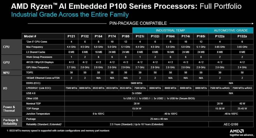新款P100系列处理器支持AMD ROCm软件,为开发人员和系统设计人员提供了更丰富且可扩展的、面向高能效边缘计算解决方案的产品组合。这些处理器可支持从视觉到控制到推理的实时AI、提供先进的图形处理能力,同时还支持工业温度范围(−40°C至105°C)、7×24小时连续运行以及10年产品生命周期。