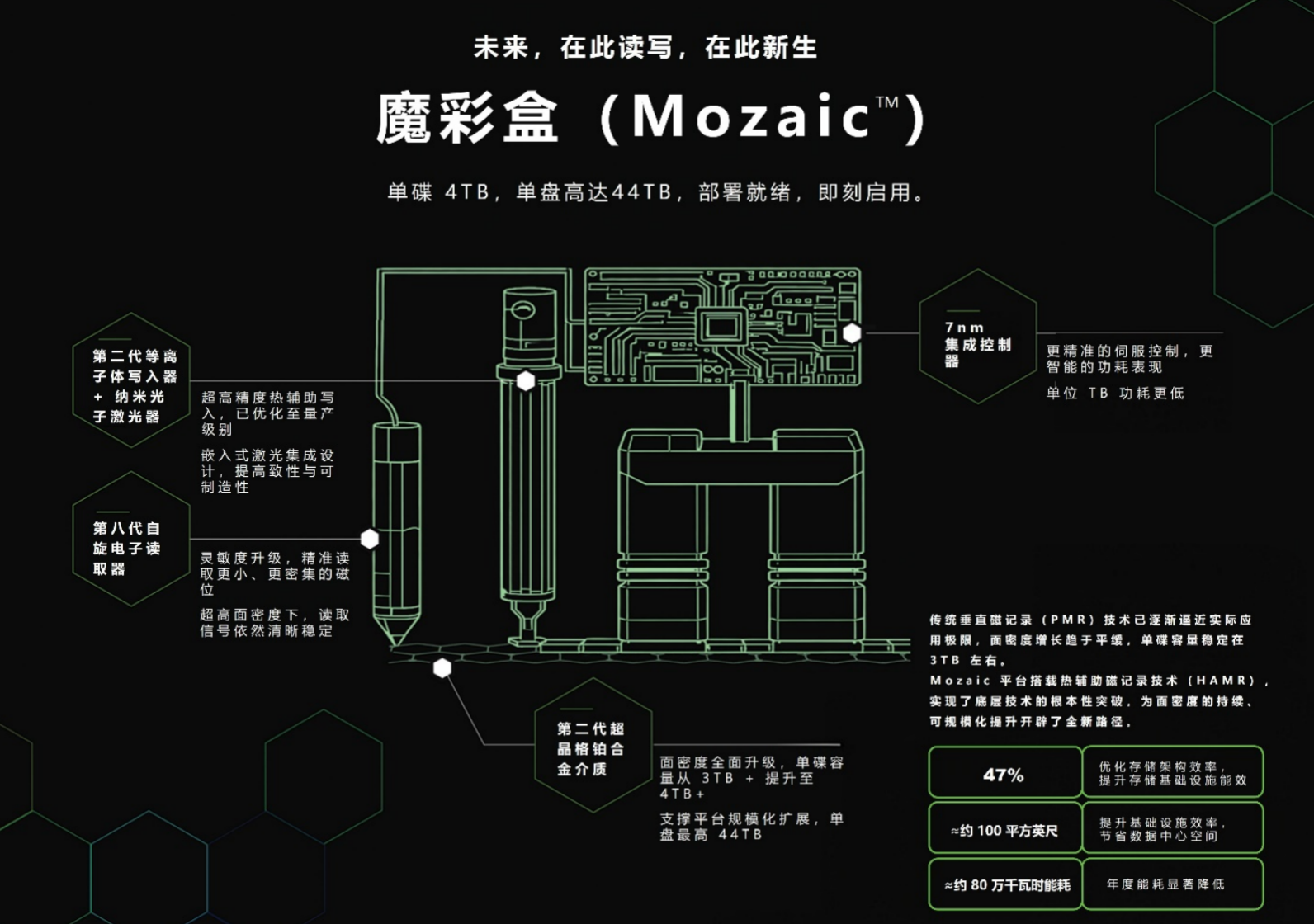 Mozaic 4+单盘容量高达44TB,其核心看点是,希捷依托HAMR技术实现了大规模高密度落地,并通过第二代等离子体写入器、纳米光子激光器、第八代自旋电子读取器、7nm集成控制器等关键技术,解决了更高面密度下的写入与读取难题。配合新一代悬浮架构和增强型系统级芯片,这一平台在继续提升容量的同时,仍保持企业级可靠性。