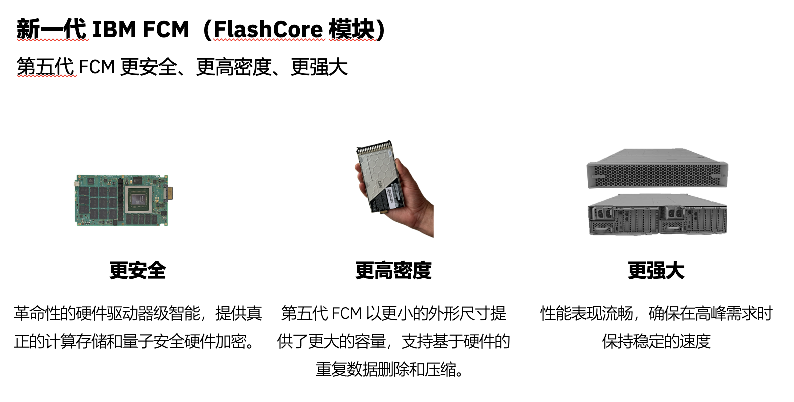 这次采访中,几位嘉宾都重点提到的是一个叫 FCM(FlashCore Module)的东西,这是IBM自研的专有闪存模块,用在IBM的全闪存存储系统FlashSystem系统中,目前已经进化到第五代了。