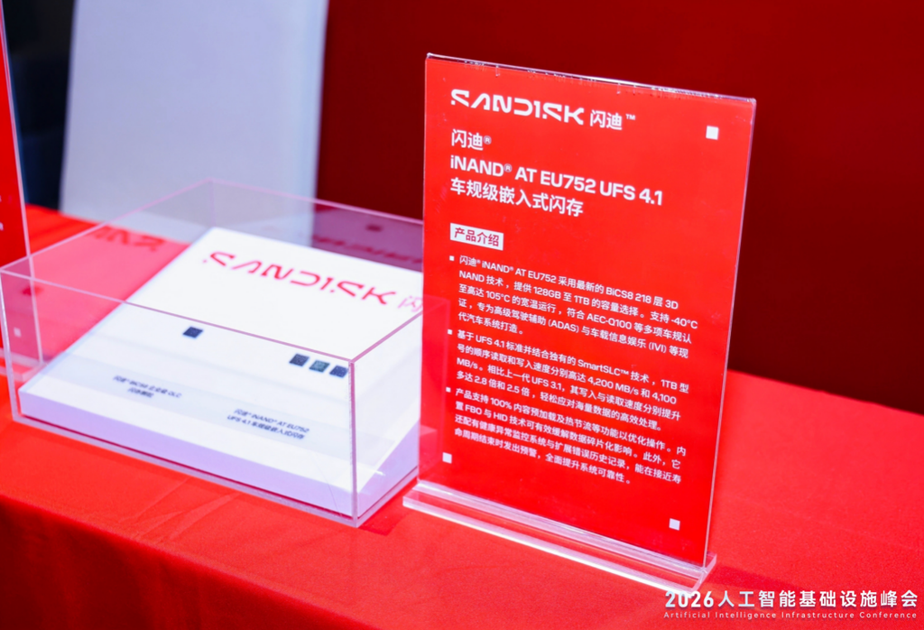 汽车领域,闪迪iNAND® AT EU752 UFS 4.1嵌入式闪存驱动器同样是闪迪首款采用UFS 4.1标准的车规级嵌入式闪存产品,为智能座舱、车机系统和本地AI处理提供更高性能、更高可靠性的车规级存储支持。