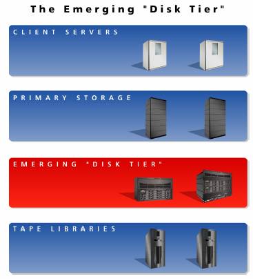 由于磁盘和磁带共存,Taneja Group常提到在数据保护等级中出现一个“磁盘层”(如下图所示)。在传统的磁带备份体系中,磁带库与备份服务器和软件之间维持直接的关系;而基于磁盘的方案则建立了一个平台,在磁带库的功能以外(或替代其功能),直接与现存的备份服务器环境互相作用。通过在备份中采用磁盘层,用户既保持了原有的磁带环境下的传统的备份及恢复功能,又增加了灵活度。