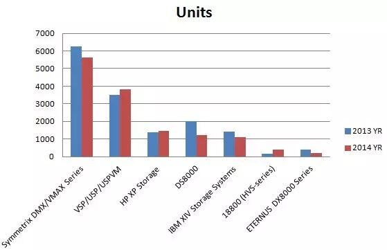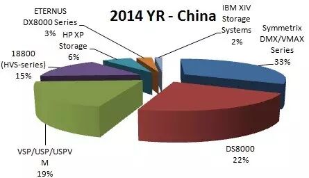 EMC Symmetrix占据1/3的份额,华为的18800排在第四,并且超过后面HP XP和富士通DX8000和XIV三者的总和还多,挤入主流产品行列。