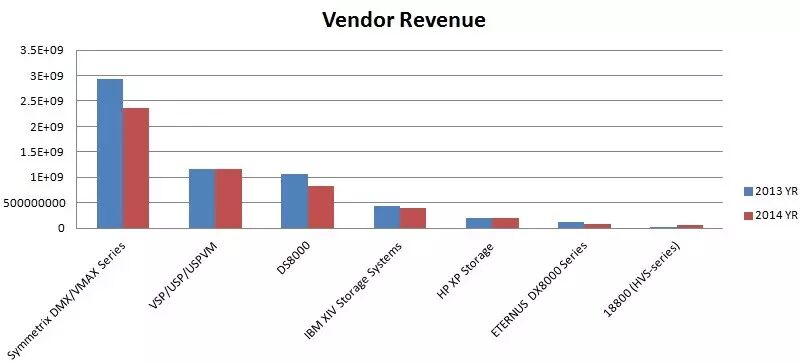 首先,我们看看高端存储的出货数量。我们看到,由于HDS发布了新的高端产品VSP G1000,因此HDS VSP和HP XP(OEM HDS)在数量上是增长的。而华为作为后来的高端存储厂商,其18800快速增长(在数量上也超过了富士通)。其余的高端存储,2014年都是下滑的。