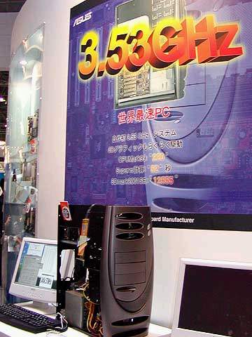 华硕公司为WPC EXPO 2002展会带来的经过液态氮制冷的3.53GHz主机系统。此时系统总线被超频到157MHz,其实际频率只有3,455MHz,倍频为22倍。应该算是目前世界上最快速的PC整机了。