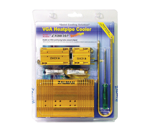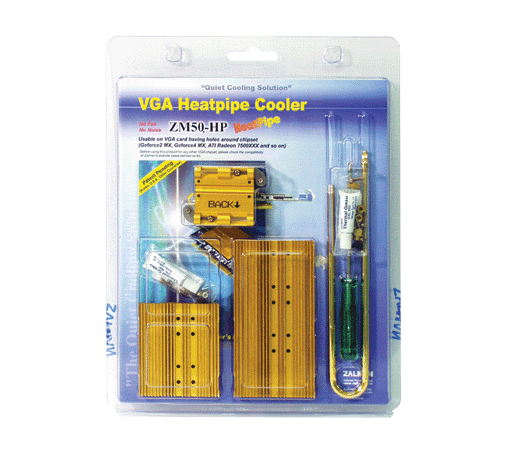 这款名为ZM50-HP的显卡散热器,适用于Nvidia Geforce2 MX, Geforce4 MX,ATI Radeon 7000, 7200, 7500等显卡的散热器,看得出这款显卡散热器并不是支持一些高档的显卡,整套显卡散热器包括有前散热器和后散热器各一个,热管一条,两款大型的散热片,1包配套螺丝(包括硅脂),后备配套螺丝(包括硅脂).这款显卡散热器也被誉为进阶级的显卡散热器。