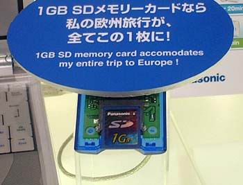 在WPC EXPO 2002上,松下电器产业展区展示出了很多数码映像产品,吸引了众多的参观者。在此中间,作为参考展示,展出了定于2003年秋上市的1GB SD卡。此次展出的1GB SD卡不仅容量大,而且写入和读取速度也提高到了20MB/秒。目前销售的256MB和512MB的SD卡为10MB秒,单纯计算的话,速度提高到了原来的2倍。对于64MB和128MB的2MB/秒的速度而言,速度更是提高了10倍。