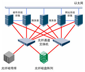 SAN将上述两种方法的优点结合到一起,它的做法是:对备份和恢复进行集中式管理,将一到多台磁带设备分配给每个服务器,使用FC协议将数据直接从磁盘设备传递给磁带设备。