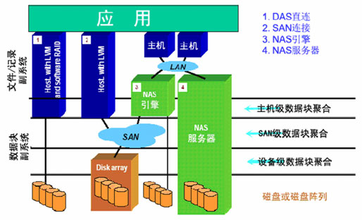在一个SAN系统中,服务器全连接到一个数据网络。全面增加对一个企业共有存储阵列的连接。高效率和经济的存储分配可以通过聚合的和高磁盘使用率中获得。一个NAS系统包含一个在一台NAS服务器中的一个文件系统并通过以太网接口连接到目前或新的以太网络里,同时使用企业的存储。