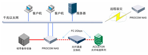 大恒存储NAS引擎技术方案采用美国Procom公司NetForce 1750、Brocade Silmwork 3200和大恒ACCSTOR FS8000(或其他厂商的光纤阵列产品)作为核心存储平台,为用户建立存储区域网和网络附加存储网络两个存储网络,通过NetForce1750作为存储网关使两者有机结合。