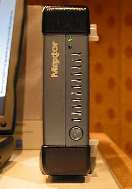 图示为迈拓容量为120GB的数据备份外置式存储器 可选容量还有80GB和250GB两种,从其名称上就可以看出该款存储器的好处。对,用户只需一按键,数据备份软件即可开始对用户的数据进行自动备份,可谓十分便价,具体价格及上市日期目前还未知。
