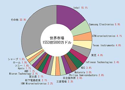 韩国三星电子跃升至第二。该公司的营业额为91亿7600万美元,与上年相比猛增了49.5%。STMicroelectronics公司成功卫冕第三,不过营业额却比上年下降了0.9%。排第四的是美国德州仪器公司,其营业额同比增长了2.5%。第五位为东芝,它在上年排名第二,结果营业额一蹶不振下降了5.5%。全球市场总规模为1553亿5000万美元,与上年相比增长了1.5%。