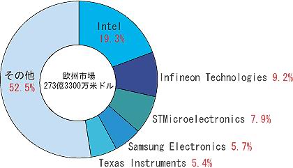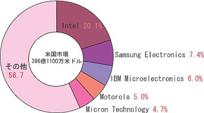 从按不同地区排名的结果可以看出,除了日本市场(图2)以外,Intel在美国(图3)、亚洲(图4)、欧洲(图5)各市场均占据了10%以上的市场,为第一大半导体制造商。在日本市场上以东芝为首的日本半导体制造商实力强劲。除了松下电器产业从上年的第六位升至今年第四位以外,其余前五位排名没有变化。另外,日本的市场规模为327亿1800万美元,比上年下降了6.7%。