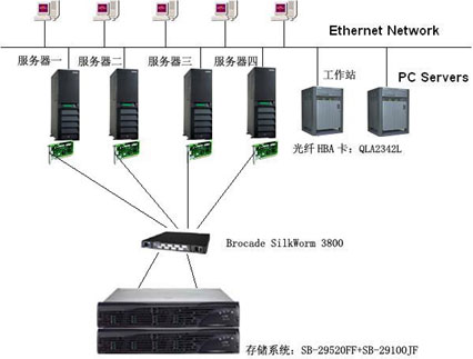 其中SB-29520FF配置3.5TB 裸容量、4个2Gb/s高速光纤主机接口和2GB支持镜像写的高速缓存。SB-29520FF通过2条2Gbps光缆与SAN中的SilkWorm 3800交换机连接,前端与SAN连接带宽共8Gbps,目前使用4Gbps,将来在需要增加服务器数量时、可将光纤通道交换机的端口扩展到32个,再将前端主机通道全部连接入SAN网络,形成8Gbps带宽;