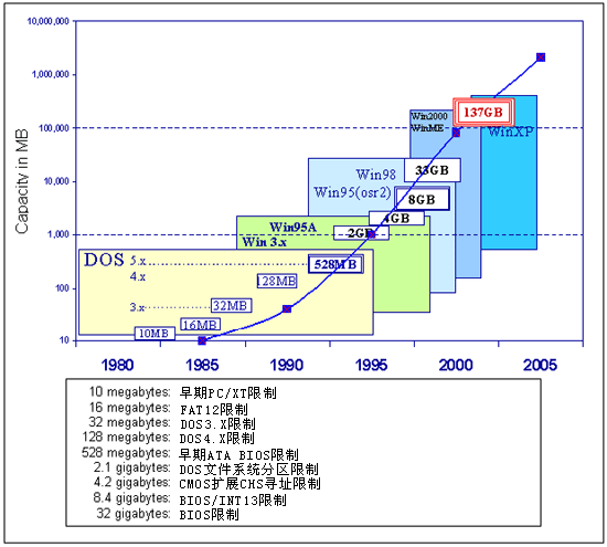 自1980年开始,硬盘容量限制问题已成为个人电脑界内不争的事实,在过去15年间存储业内至少发生过10次左右的容量障碍问题,最为人们熟悉的可能就是 528MB及 8.4GB的硬盘容量限制。这些已经发现的容量限制问题都已被成功解决,因而人们都慢慢淡望了它的存在,但旧问题的解决并不意味着就没有新问题的出现,根据对目前硬盘设计机制及工作原理的分析,不难看出,下一个将出现的容量障碍点将是 137GB。