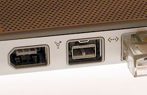 17英寸PowerBook G4的右侧面。左为6引针的IEEE1394,中央为FireWire 800(IEEE1394b),右为1000M以太网接口(如下图所示)