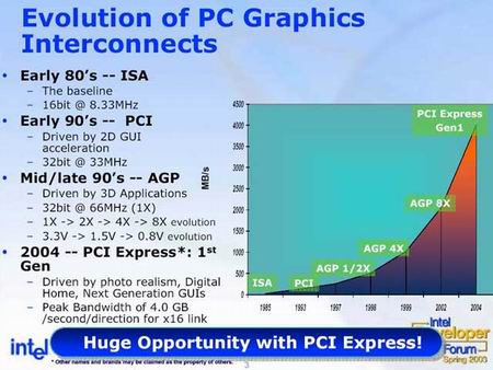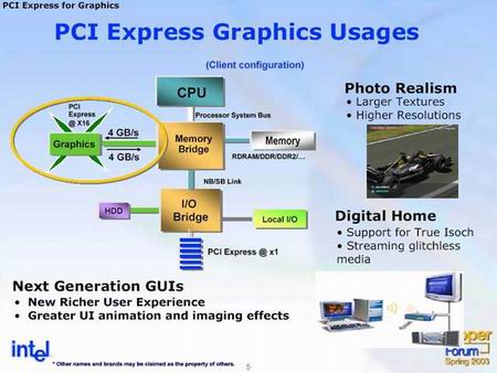 在IDF 2003上,除了SATA接口技术及样品展示令我们备加关注外,作为新一代图形接口技术,PCI Express系统总线的发表也是十分值得关注,新总线的发表也就意味着下一代PCI Express图形界面的制订。