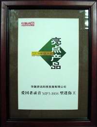 经过严格评选,爱国者迷你王(录音MP3-H08型)产品在移动存储类产品中技压群芳,夺得了“2002?2003 CPW年度大赏”的“亮点产品”奖项,再次展现了爱国者在移动存储类产品技术上的领导实力。