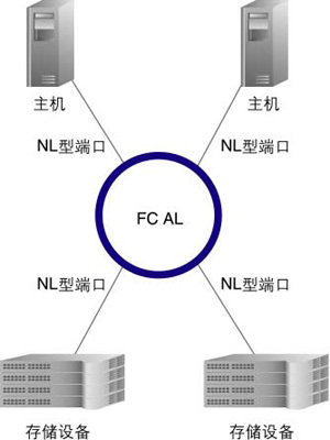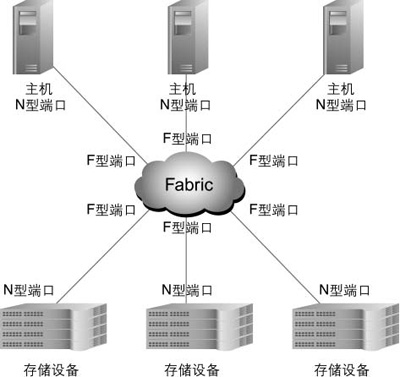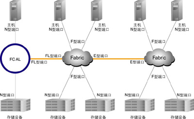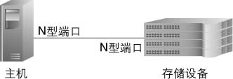 光纤通道技术中,设备互连有3种基本实现方式: 点对点(如图1所示)、光纤仲裁环(如图2所示)和交换式连接(如图3所示)。在这3种不同的方式中,设备接入SAN的工作机制略有区别,在技术上,我们称之为不同的端口类型。在点对点的连接中,设备提供N型端口;在光纤环路中,设备提供NL型端口;在交换式连接中,设备提供N型端口,而交换机提供F型端口。