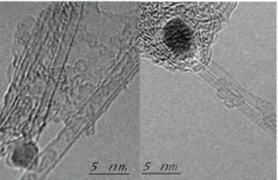 远藤等人合成的直径0.43nm的碳纳米管。左边,作为触媒的纳米粒子位于纳米管的顶端。