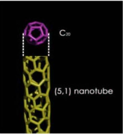 【图1】最小尺寸的富勒烯C20和螺旋指数(5,1)的碳纳米管的计算机模拟比较图