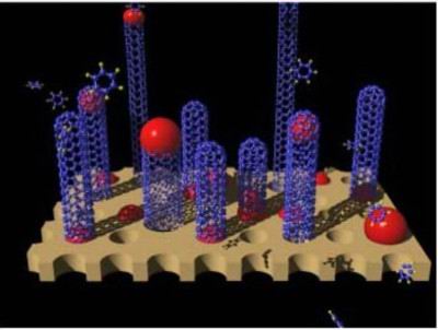 【图2】碳纳米管(紫色)由作为触媒的纳米粒子(红色)生成的状态