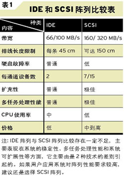 事实上,在技术方面,近两年,IDE硬盘技术不断突破,无论从转速、存储容量还是传输速率都有了很大的提升,另外,通过采用SCA-2技术,还解决了IDE硬盘热插拔问题。可以说,在功能上,IDE阵列几乎具备SCSI阵列的所有特点(表1列出IDE阵列与SCSI阵列的区别)。主要有以下几点。