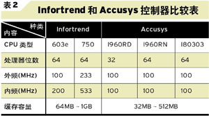 RAID控制器 RAID控制器性能决定着整个磁盘阵列的性能(传输带宽、I/O响应时间、RAID初始化时间、故障恢复时间和管理功能等),磁盘阵列的核心技术都集中于此。目前市场上的IDE阵列的控制器90%以上都来自中国台湾。根据RISC CPU的不同,可分为两个流派,第一个是普安产品(Infortrend),CPU采用IBM的Power PC(603e和750),第二个以世仰产品(Accusys)为代表,CPU采用Intel的I960系列(I960RD、I960RN和80303)。表2给出两者的性能特点。