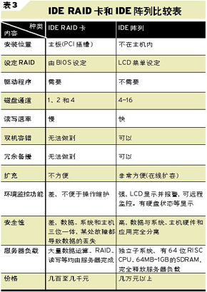 随着IDE阵列的兴起,市面上涌现出许多IDE RAID卡,像Adaptec、Promise和Highpoint IDE RAID卡,其价格较IDE阵列更为低廉。其实,作为桌面型的应用,其存储性能的确被大大提高了,但是作为服务端设备,无法提供高质量服务,远远满足不了应用需要。两者具体性能差别请见表3。